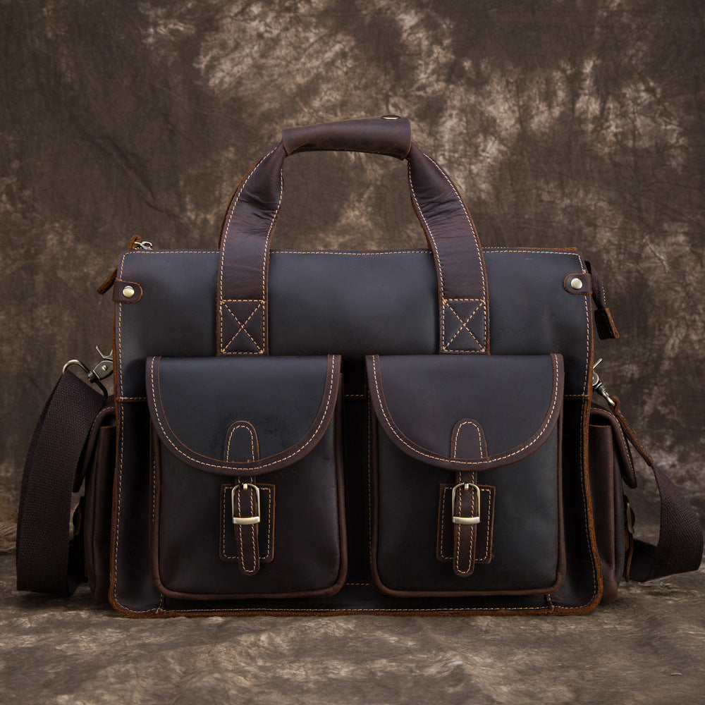 is crafted from first-layer cowhide with a dark brown Crazy Horse finish, giving every bag a unique character that only gets better with age. Designed as both a briefcase and shoulder messenger, it offers the perfect balance of rugged durability and professional style. Its smart 35cm x 15cm x 28cm size fits laptops, documents, and daily essentials without the bulk. Built to last a lifetime, this is the briefcase that grows with you and tells your story through every mark and shade.